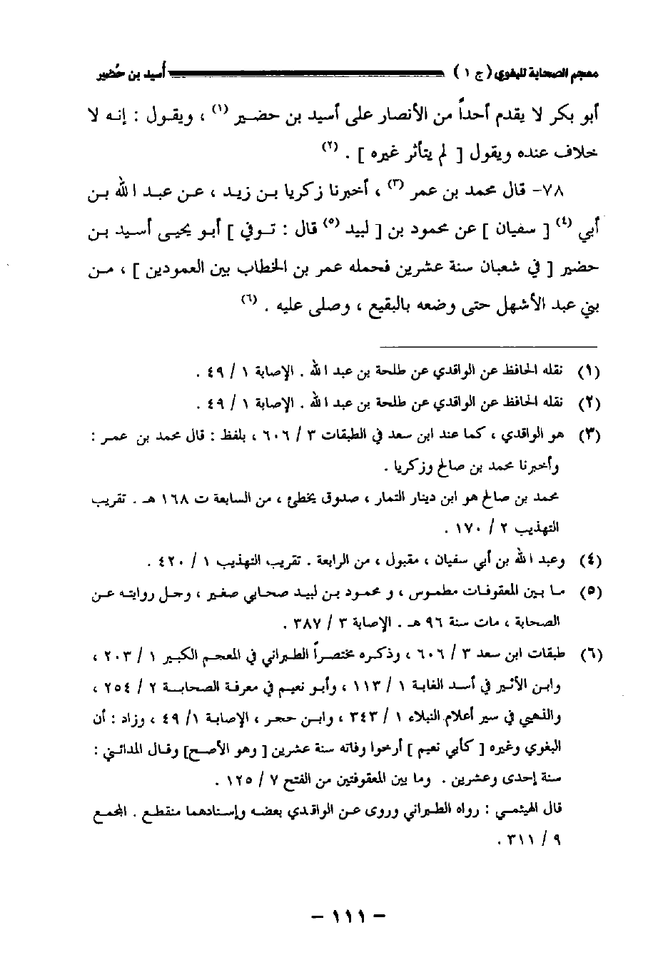 ٧٨ - قال محمد بن عمر أخبرنا زكريا بن زيد عن عبد الله بن أبي [سفيان] عن محمود بن [لبيد قال: توفي] أبو يحيى أسيد بن حضير [في شعبان سنة عشرين فحمله عمر بن الخطاب بين العمودين] من بني عبد الأشهل حتى وضعه بالبقيع وصلى عليه.