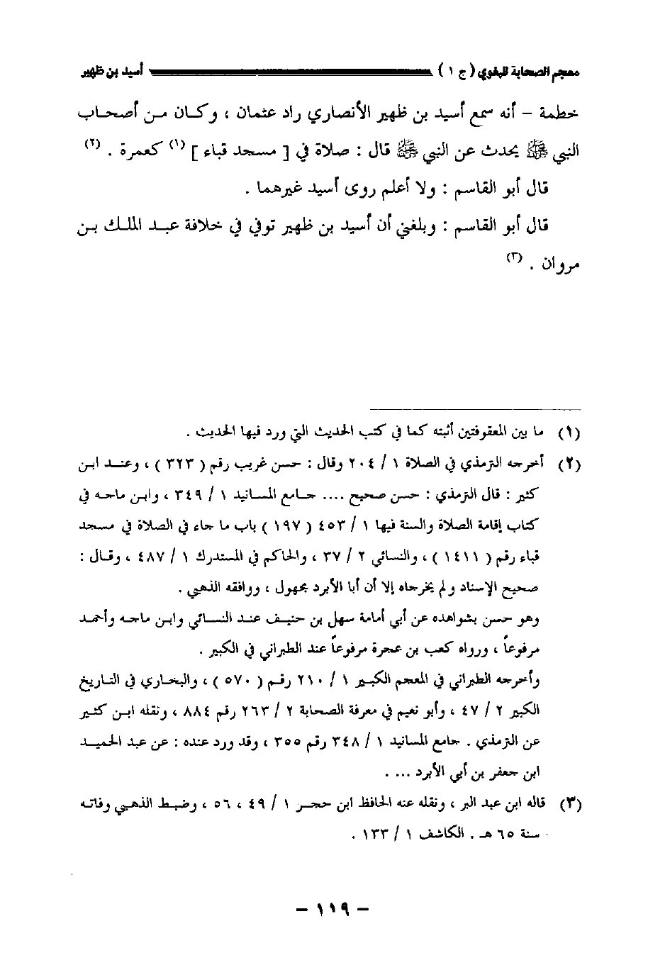 خطمة أنه سمع أسيد بن ظهير الأنصاري راد عثمان وكان من أصحاب النبي صلى الله عليه وسلم يحدث عن النبي صلى الله عليه وسلم قال: صلاة في [مسجد قباء] كعمرة.