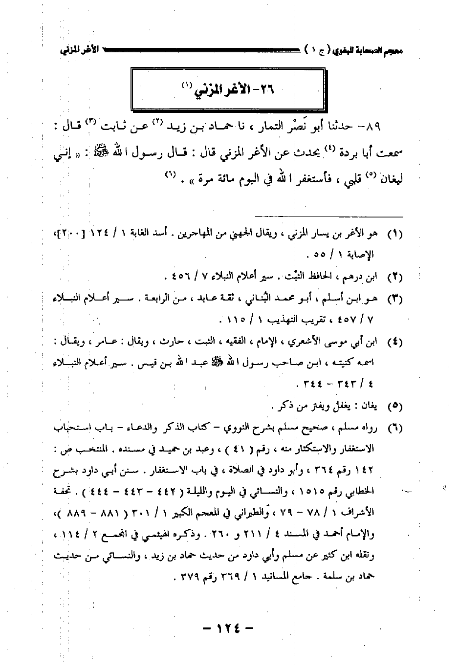 ٨٩ - حدثنا أبو نصر التمار نا حماد بن زيد عن ثابت قال: سمعت أبا بردة يحدث عن الأغر المزني قال: قال رسول الله صلى الله عليه وسلم: " إني ليغان قلبي فأستغفر الله في اليوم مائة مرة.