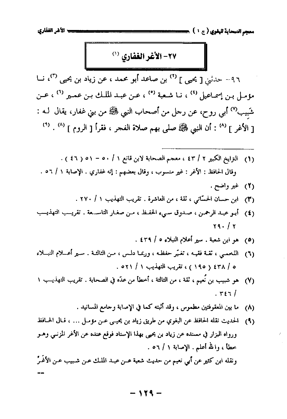 ٩٦ - حدثني [يحيى] بن صاعد أبو محمد عن زياد بن يحيى نا مؤمل بن إسماعيل نا شعبة عن عبد الملك بن عمير عن شبيب أبي روح عن رجل من أصحاب النبي صلى الله عليه وسلم من بني غفار يقال له: [الأغر]: أن النبي صلى الله عليه وسلم صلى بهم صلاة الفجر فقرأ [الروم].