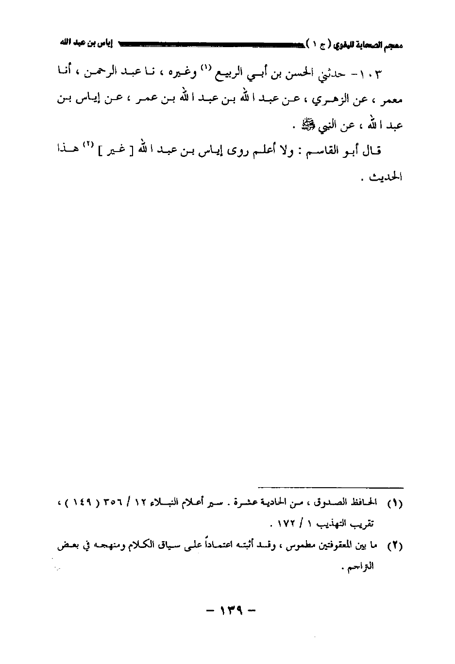 ١٠٣ - حدثني الحسن بن أبي الربيع وغيره نا عبد الرحمن أنا معمر عن الزهري عن عبد الله بن عبد الله بن عمر عن إياس بن عبد الله عن النبي صلى الله عليه وسلم.