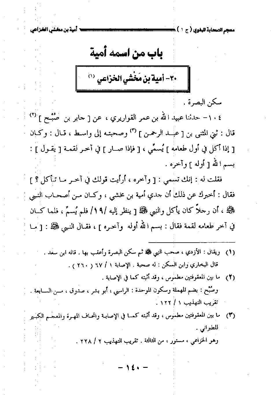 فقلت له: إنك تسمي: [وآخره أرأيت قولك في آخر ما تأكل؟] فقال: أخبرك عن ذلك أن جدي أمية بن مخشي وكان من أصحاب النبي صلى الله عليه وسلم، أن رجلا كان يأكل والنبي صلى الله عليه وسلم [ينظر إليه // ١٩ // فلم يسم فلما كان في آخر طعامه لقمه فقال: بسم الله أوله وآخره]، فقال النبي صلى الله عليه وسلم: [ما