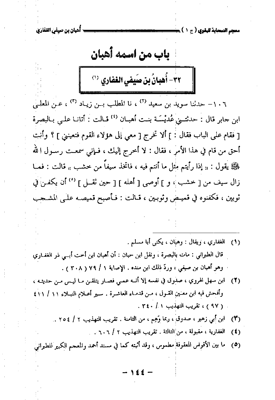 ١٠٦ - حدثنا سويد بن سعيد نا المطلب بن زياد عن المعلى بن جابر قال حدثتني عديسة بنت أهبان قالت: أتانا علي بالبصرة [فقام على الباب فقال:] ألا تخرج [معي إلى هؤلاء القوم فتعينني]؟ وأنت أحق من قام في هذا الأمر فقال: لا أخرج إليك فإني سمعت رسول الله صلى الله عليه وسلم يقول: " إذا رأيتم مثل ما أنتم فيه فاتخذ سيفا من خشب " قالت: فما زال سيف من [خشب و] أوصى [أهله] [حين ثقل] أن يكفن في ثوبين فكفنوه في قميص وثوبين، قالت: فأصبح قميصه على المشجب