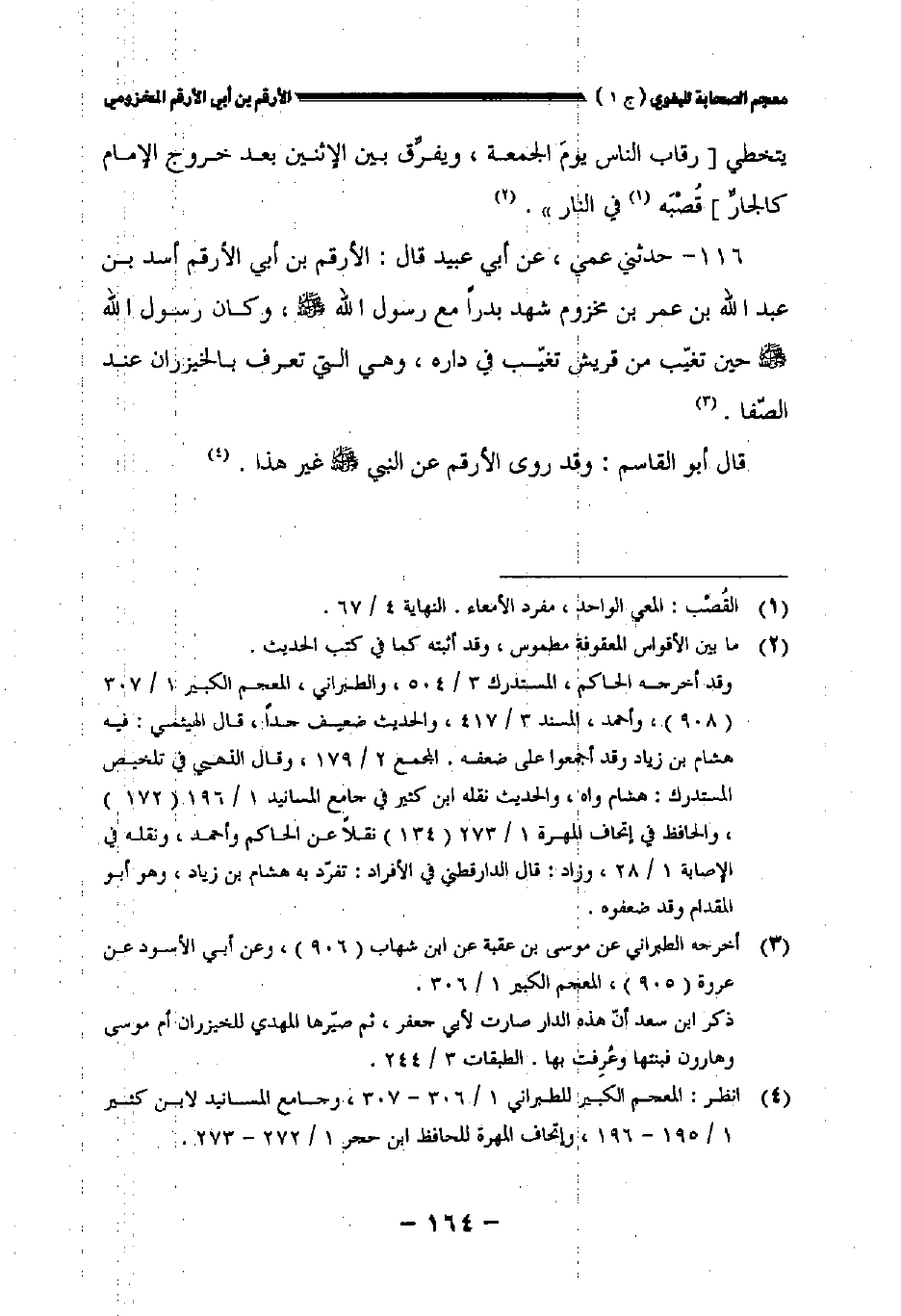 ١١٦ - حدثني عمي عن أبي عبيد قال الأرقم بن أبي الأرقم أسد بن عبد الله بن عمر بن مخزوم شهد بدرا مع رسول الله صلى الله عليه وسلم وكان رسول الله صلى الله عليه وسلم حين تغيب من قريش تغيب في داره وهي التي تعرف بالخيزران عند الصفا.