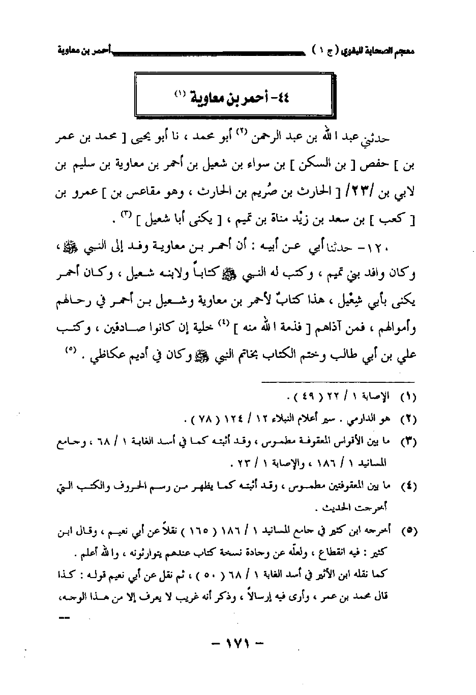 ١٢٠ - حدثنا أبي عن أبيه أن أحمر بن معاوية وفد إلى النبي صلى الله عليه وسلم وكان وافد بني تميم وكتب له النبي صلى الله عليه وسلم كتابا ولابنه شعيل وكان أحمر يكنى بأبي شعيل، هذا كتاب لأحمر بن معاوية وشعيل بن أحمر في رحالهم وأموالهم فمن آذاهم [فذمه الله منه] خلية إن كانوا صادقين وكتب علي بن أبي طالب وختم الكتاب بخاتم النبي صلى الله عليه وسلم وكان في أديم عكاظي.