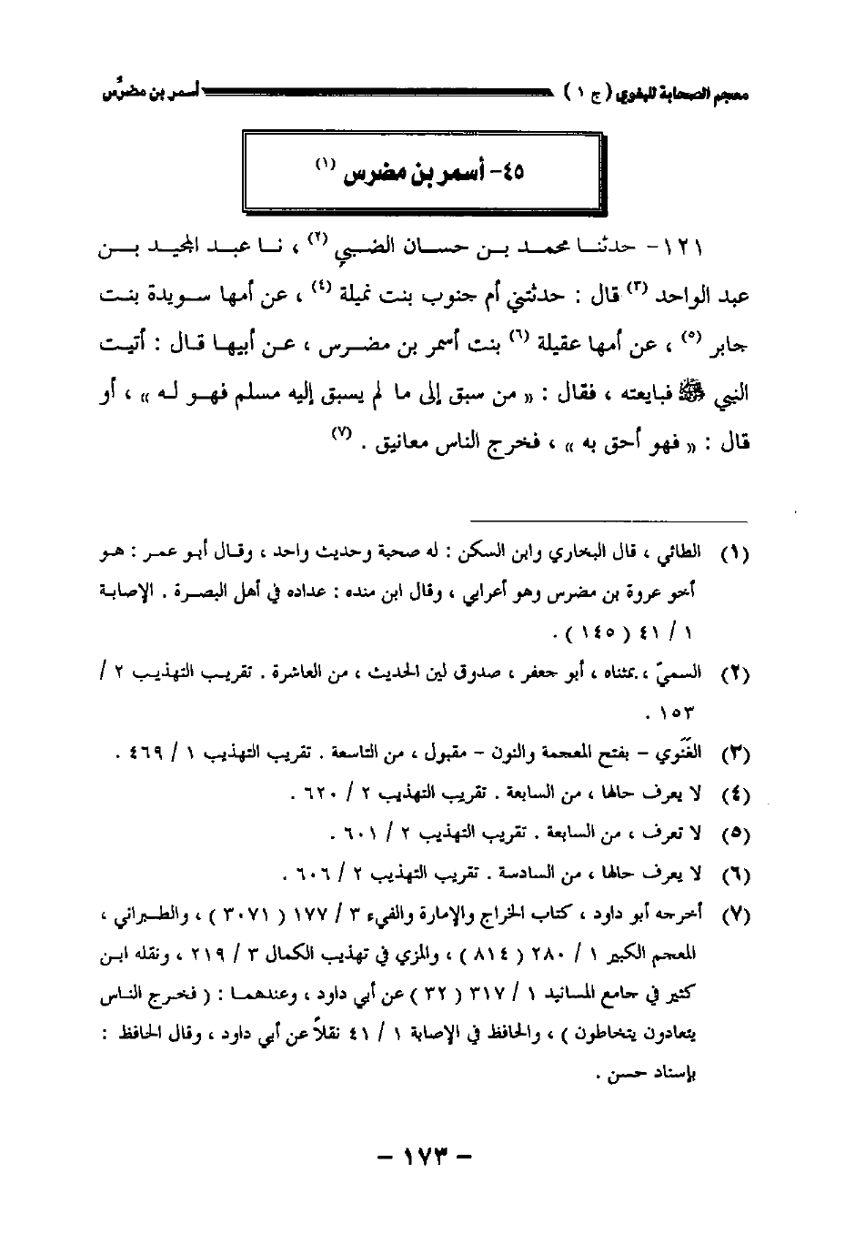 ١٢١ - حدثنا محمد بن حسان الضبي نا عبد المجيد بن عبد الواحد قال حدثني أم جنوب بنت نميلة عن أمها سويدة بنت جابر عن أمها عقيلة بنت أسمر بن مضرس عن أبيها قال: أتيت النبي صلى الله عليه وسلم فبايعته فقال: " من سبق إلى ما لم يسبق إليه مسلم فهو له " أو قال: " فهو أحق به " فخرج الناس معانيق.