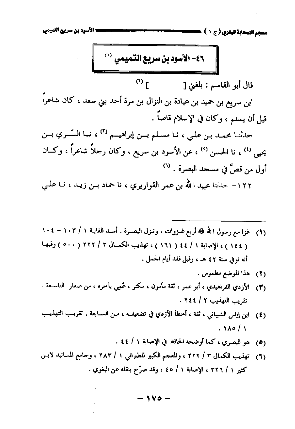 حدثنا محمد بن علي نا مسلم بن إبراهيم نا السري بن يحيى نا الحسن عن الأسود بن سريع وكان رجلا شاعرا وكان أول من قص في مسجد البصرة.