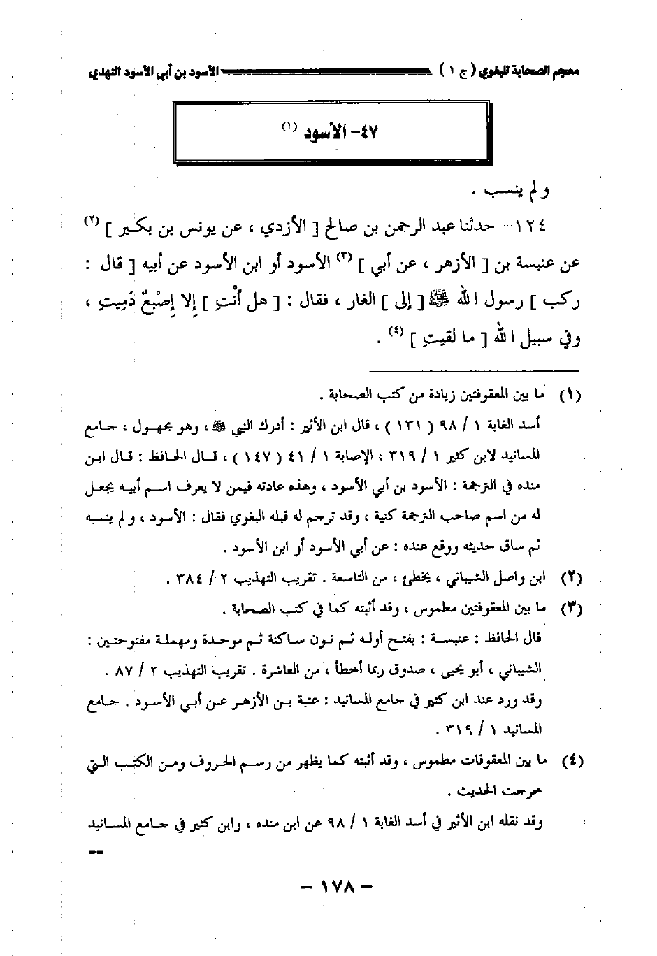 ١٢٤ - حدثنا عبد الرحمن بن صالح [الأزدي عن يونس بن بكير] عن عنبسة بن [الأزهر عن أبي] الأسود أو ابن الأسود عن أبيه [قال: ركب] رسول الله صلى الله عليه وسلم [إلى] الغار، فقال: [هل أنت] إلا إصبع دميت وفي سبيل الله [ما لقيت].