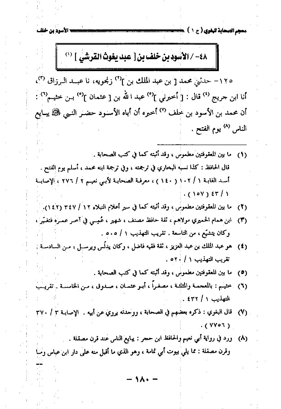 ١٢٥ - حدثني محمد [بن عبد الملك بن] زنجويه، حدثنا عبد الرزاق أخبرنا ابن جريج، قال: [أخبرني] عبد الله بن [عثمان] بن خثيم: أن محمد بن الأسود بن خلف أخبره أن أباه الأسود حضر النبي صلى الله عليه وسلم يبايع الناس يوم الفتح.
