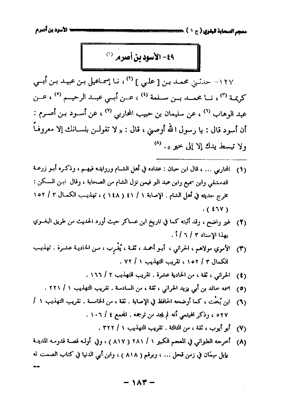 ١٢٧ - حدثني محمد بن [علي] نا إسماعيل بن عبيد بن أبي كريمة نا محمد بن سلمة عن أبي عبد الرحيم عن عبد الوهاب عن سليمان بن حبيب المحاربي عن أسود بن أصرم: أن أسود قال: يارسول الله أوصني قال: " لا تقولن بلسانك إلا معروفا ولا تبسط يدك إلا إلى خير.