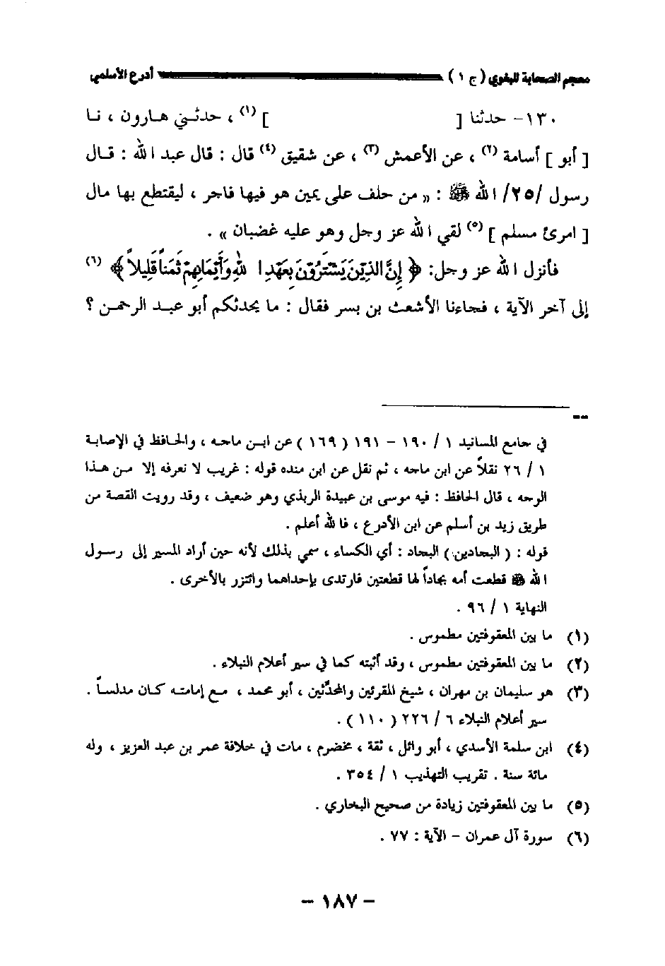 ١٣٠ - حدثنا [] حدثني هارون نا [أبو] أسامة عن الأعمش عن شقيق قال قال عبد الله: قال رسول الله صلى الله عليه وسلم: " من حلف على يمين هو فيها فاجر ليقتطع بها مال [امرىء مسلم] لقي الله عز وجل وهو عليه غضبان ".