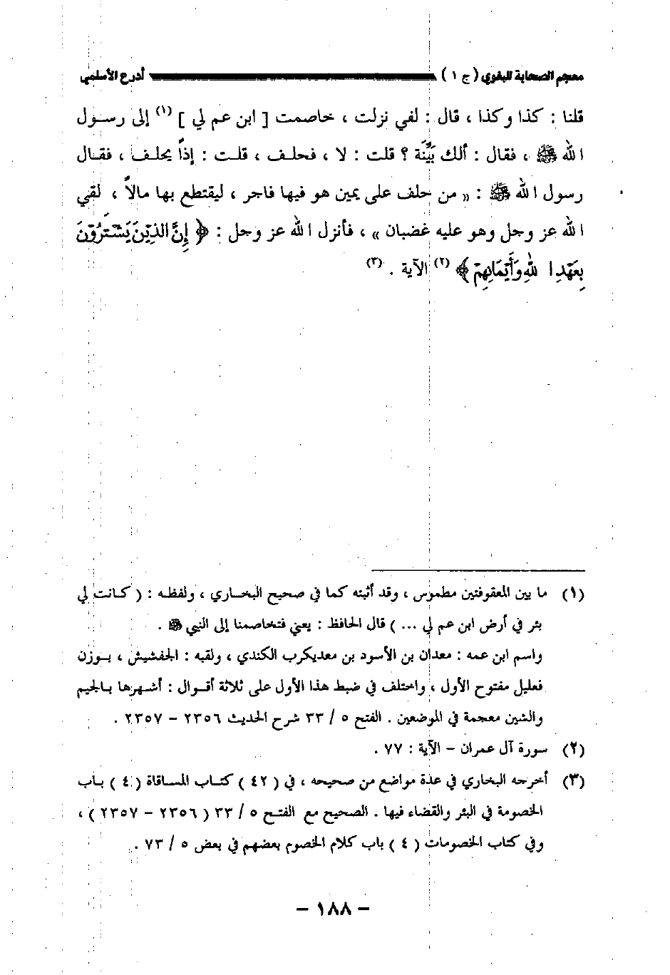 قلنا: كذا وكذا، قال: لفي نزلت، خاصمت [ابن عم لي] إلى رسول الله صلى الله عليه وسلم فقال: ألك بينه؟ قلت: لا، فحلف، قلت: إذا يحلف فقال رسول الله صلى الله عليه وسلم: " من حلف على يمين هو فيها فاجر ليقتطع بها مالا لقي الله عز وجل وهو عليه غضبان " فأنزل الله عز وجل {إن الذين يشترون بعهد الله وأيمانهم} الآية.