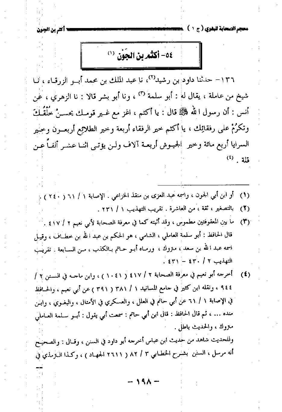 ١٣٦ - حدثنا داود بن رشيد نا عبد الملك بن محمد أبو الزرقاء نا شيخ من عاملة يقال له أبو سلمة ونا أبو بشر قالا نا الزهري عن أنس: أن رسول الله صلى الله عليه وسلم قال: ياأكثم، اغز مع غير قومك يحسن خلقك وتكرم على رفقائك ياأكثم خير الرفقاء أربعة وخير الطلائع أربعون وخير السرايا أربع مائة وخير الجيوش أربعة آلاف ولن يؤتى اثنا عشر ألفا عن قلة.