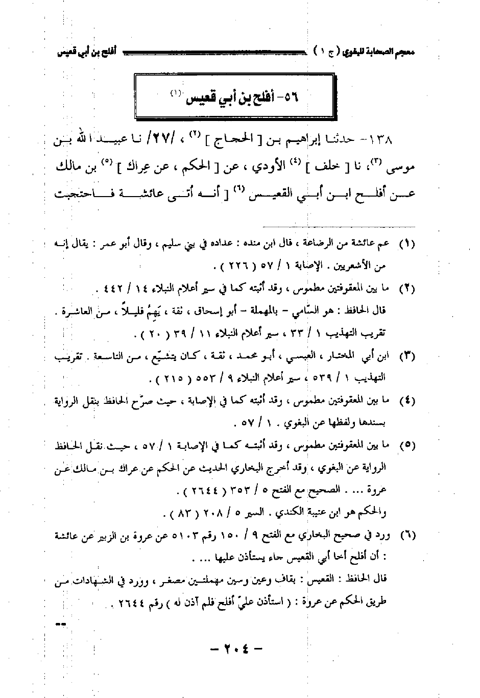 ١٣٨ - حدثنا إبراهيم بن [الحجاج] // ٢٧ // نا عبيد الله بن موسى نا [خلف] الأودي عن [الحكم عن عراك] بن مالك عن أفلح بن أبي القعيس [أنه أتى عائشة فاحتجبت