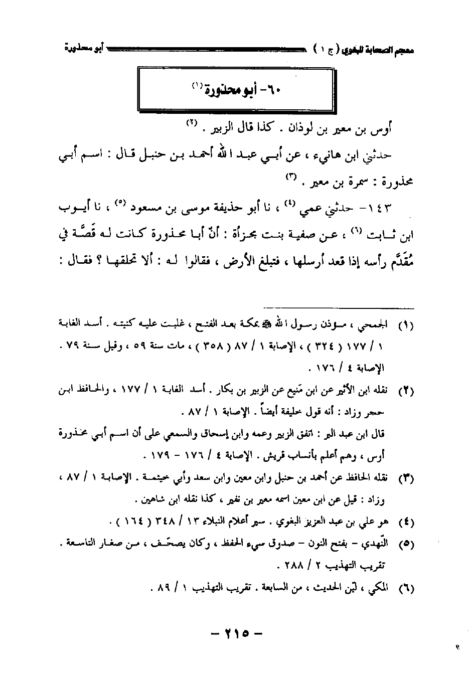 ١٤٣ - حدثني عمي، حدثنا أبو حذيفة موسى بن مسعود نا أيوب بن ثابت عن صفية بنت مجزأة: أن أبا محذورة كانت له قصة في مقدم رأسه إذا قعد أرسلها فتبلغ الأرض فقالوا له: ألا تحلقها؟ فقال: