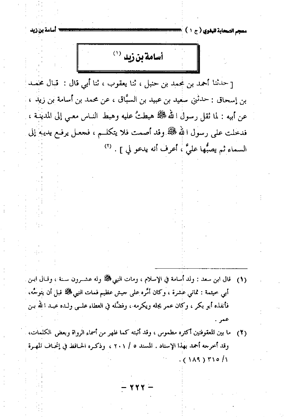[حدثنا أحمد بن محمد بن حنبل ثنا يعقوب ثنا أبي قال قال محمد بن إسحاق: حدثني سعيد بن عبيد بن السباق عن محمد بن أسامة بن زيد عن أبيه: لما ثقل رسول الله صلى الله عليه وسلم هبطت عليه وهبط الناس معي إلى المدينة فدخلت على رسول الله صلى الله عليه وسلم وقد أصمت فلا يتكلم فجعل يرفع يديه إلى السماء ثم يصبها علي أعرف أنه يدعو لي].