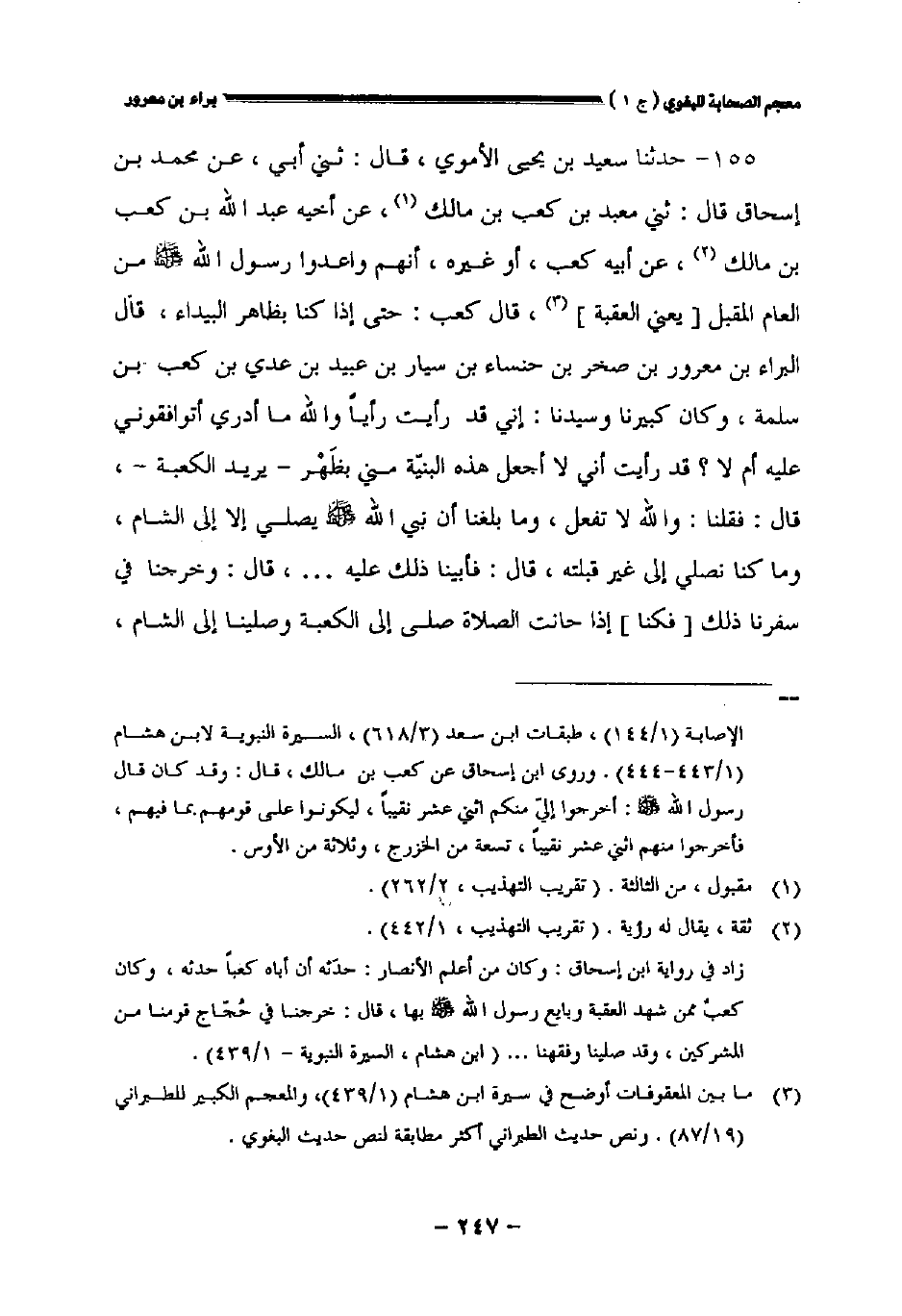 ١٥٥ - حدثنا سعيد بن يحيى الأموي قال ثني أبي عن محمد بن إسحاق قال ثني معبد بن كعب بن مالك عن أخيه عبد الله بن كعب بن مالك عن أبيه كعب أو غيره أنهم واعدوا رسول الله صلى الله عليه وسلم من العام المقبل [يعني العقبة] قال كعب: حتى إذا كنا بظاهر البيداء قال البراء بن معرور بن صخر بن حنساء بن سيار بن عبيد بن عدي بن كعب بن سلمة وكان كبيرنا وسيدنا: إني قد رأيت رأيا والله ما أدري أتوافقوني عليه أم لا؟ قد رأيت أني لا أجعل هذه البنية مني بظهر - يريد الكعبة - قال: فقلنا: والله لا تفعل وما بلغنا أن نبي الله صلى الله عليه وسلم يصلي إلا إلى الشام وما كنا نصلي إلى غير قبلته قال: فأبينا ذلك عليه، قال: وخرجنا في سفرنا ذلك [فكنا] إذا حانت الصلاة صلى إلى الكعبة وصلينا إلى الشام