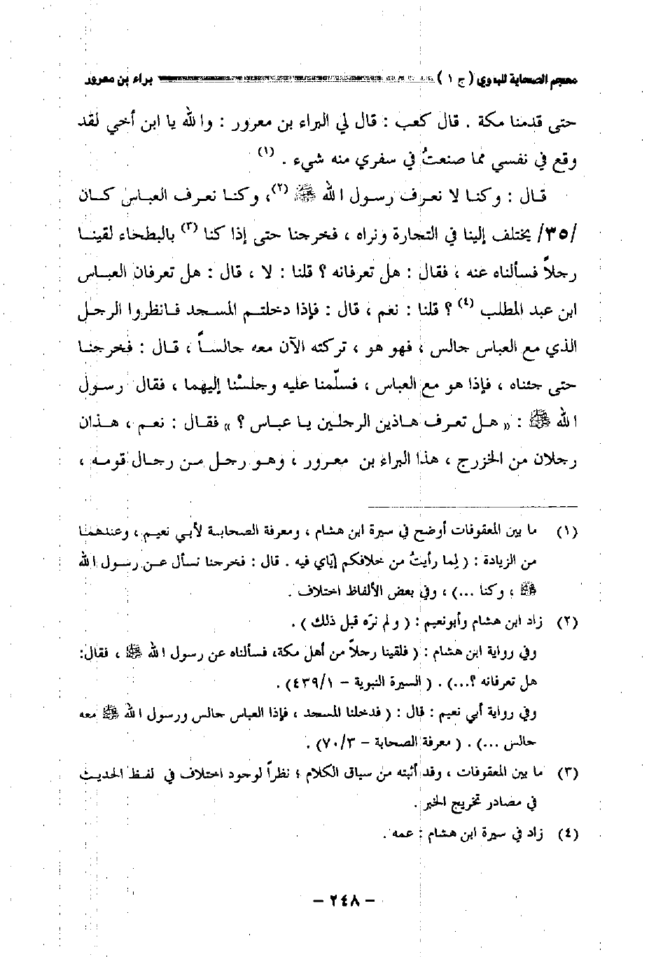 قال: وكنا لا نعرف رسول الله صلى الله عليه وسلم وكنا نعرف العباس كان // ٣٥ // يختلف إلينا في التجارة ونراه فخرجنا حتى إذا كنا بالبطحاء لقينا رجلا فسألناه عنه فقال: هل تعرفانه؟ قلنا: لا، قال: هل تعرفان العباس بن عبد المطلب؟ قلنا: نعم، قال: فإذا دخلتم المسجد فانظروا الرجل الذي مع العباس جالس فهو هو تركته الآن معه جالسا قال: فخرجنا حتى جئناه فإذا هو مع العباس فسلمنا عليه وجلسنا إليهما فقال رسول الله صلى الله عليه وسلم: " هل تعرف هذين الرجلين ياعباس؟ " فقال: نعم هذان رجلان من الخزرج، هذا البراء بن معرور، وهو رجل من رجال قومه،