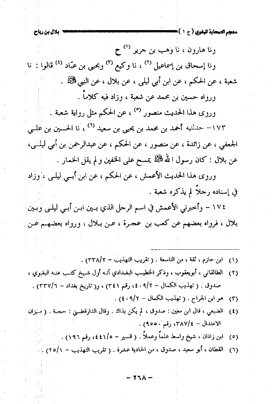 ١٧٣ - حدثنيه أحمد بن محمد بن يحيى بن سعيد نا الحسين بن علي الجعفي عن زائدة عن منصور عن الحكم عن عبد الرحمن بن أبي ليلى عن بلال: كان رسول الله صلى الله عليه وسلم يمسح على الخفين ولم يقل الخمار.