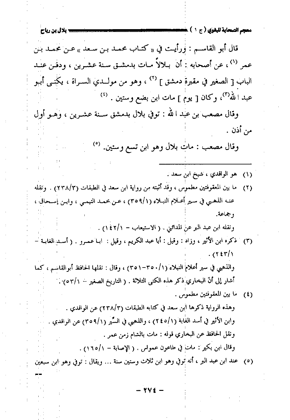 قال أبو القاسم: ورأيت في " كتاب محمد بن سعد " عن محمد بن عمر عن أصحابه: أن بلالا مات بدمشق سنة عشرين ودفن عند الباب [الصغير في مقبرة دمشق] وهو مولدي السراة يكنى أبو عبد الله وكان [يوم] مات ابن بضع وستين.