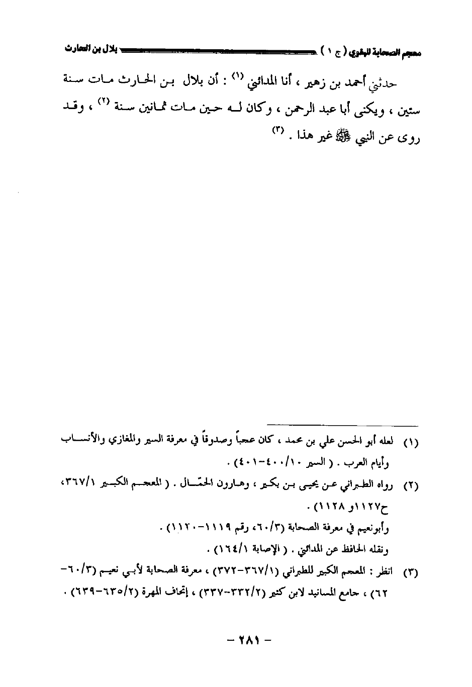 حدثني أحمد بن زهير أنا المدائني: أن بلال بن الحارث مات سنة ستين ويكنى أبا عبد الرحمن وكان له حين مات ثمانين سنة وقد روى عن النبي صلى الله عليه وسلم غير هذا.