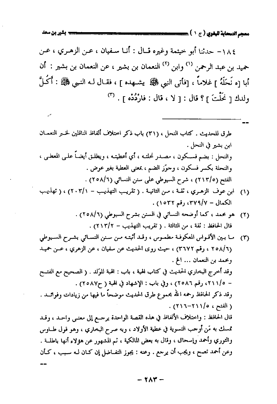 ١٨٤ - حدثنا أبو خيثمة وغيره قال: أنا سفيان عن الزهري عن حميد بن عبد الرحمن وابن النعمان بن بشير عن النعمان بن بشير: أن أبا [هـ نحله] غلاما [فأتى النبي صلى الله عليه وسلم يشهده] فقال له النبي صلى الله عليه وسلم: أكل ولدك [نحلت]؟ قال: [لا قال: فاردده].