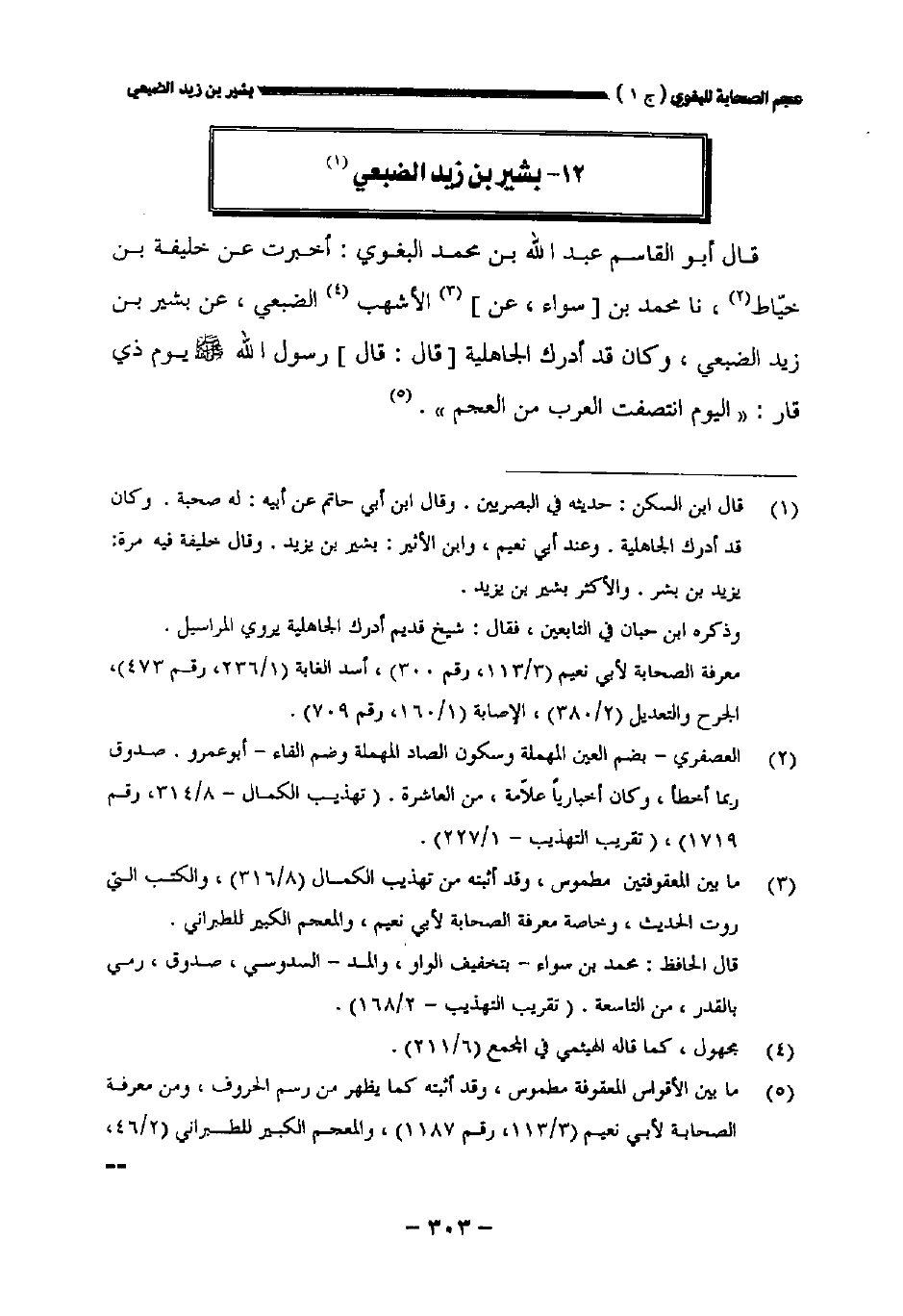 قال أبو القاسم عبد الله بن محمد البغوي: أخبرت عن خليفة بن خياط نا محمد بن [سواء عن] الأشهب الضبعي عن بشير بن زيد الضبعي وكان قد أدرك الجاهلية [قال: قال] رسول الله صلى الله عليه وسلم يوم ذي قار: " اليوم انتصف العرب من العجم.
