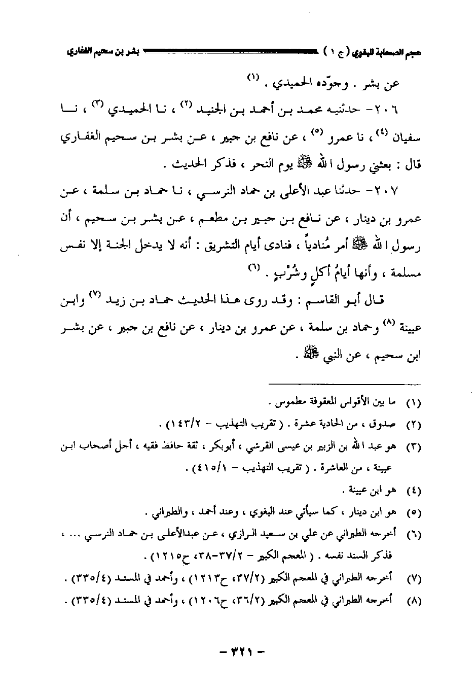 ٢٠٦ - حدثنيه محمد بن أحمد بن الجنيد نا الحميدي نا سفيان نا عمرو عن نافع بن جبير عن بشر بن سحيم الغفاري قال: بعثني رسول الله صلى الله عليه وسلم يوم النحر فذكر الحديث.