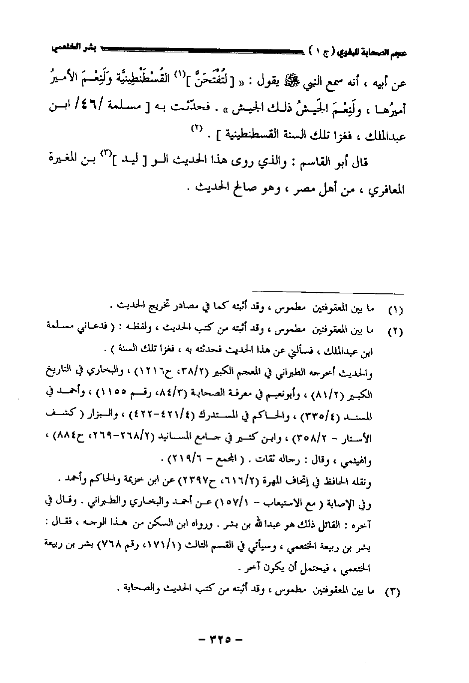 عن أبيه أنه سمع النبي صلى الله عليه وسلم يقول: " [لتفتحن] القسطنطينية ولنعم الأمير أميرها ولنعم الجيش ذلك الجيش ". فحدثت به [مسلمة // ٤٦ // بن عبد الملك فغزا تلك القسطنطينية].
