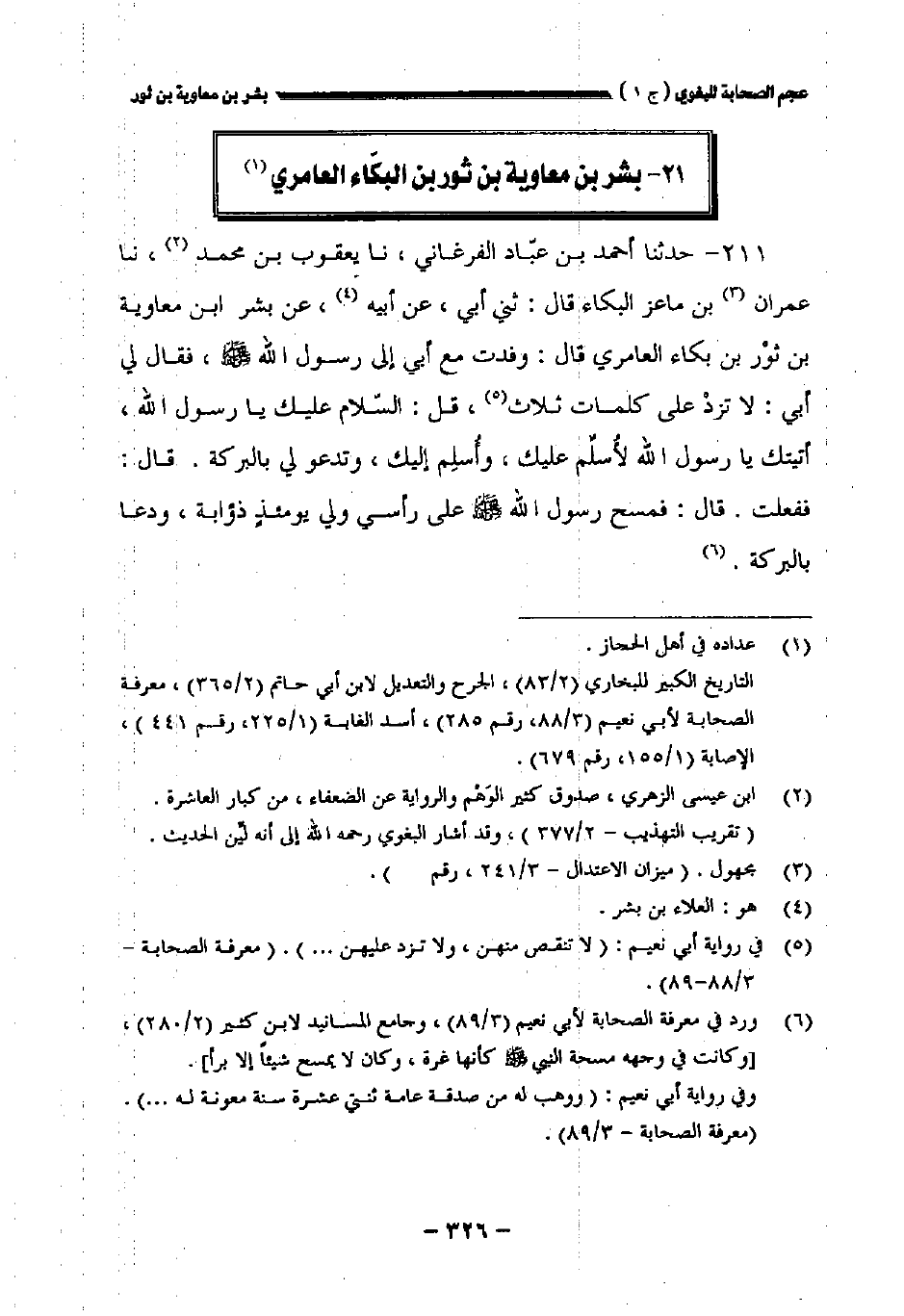 ٢١١ - حدثنا أحمد بن عباد الفرغاني، حدثنا يعقوب بن محمد، حدثنا عمران بن ماعز البكاء، قال: حدثني أبي، عن أبيه، عن بشر بن معاوية بن ثور البكاء العامري، قال: وفدت مع أبي إلى رسول الله صلى الله عليه وسلم، فقال لي أبي: لا تزد على كلمات ثلاث، قل السلام عليك يا رسول الله، أتيتك يا رسول الله لأسلم عليك، وأسلم إليك، وتدعو لي بالبركة. قال: ففعلت. قال: فمسح رسول الله صلى الله عليه وسلم على رأسي، ولي يومئذ ذؤيبة، ودعا لي بالبركة.