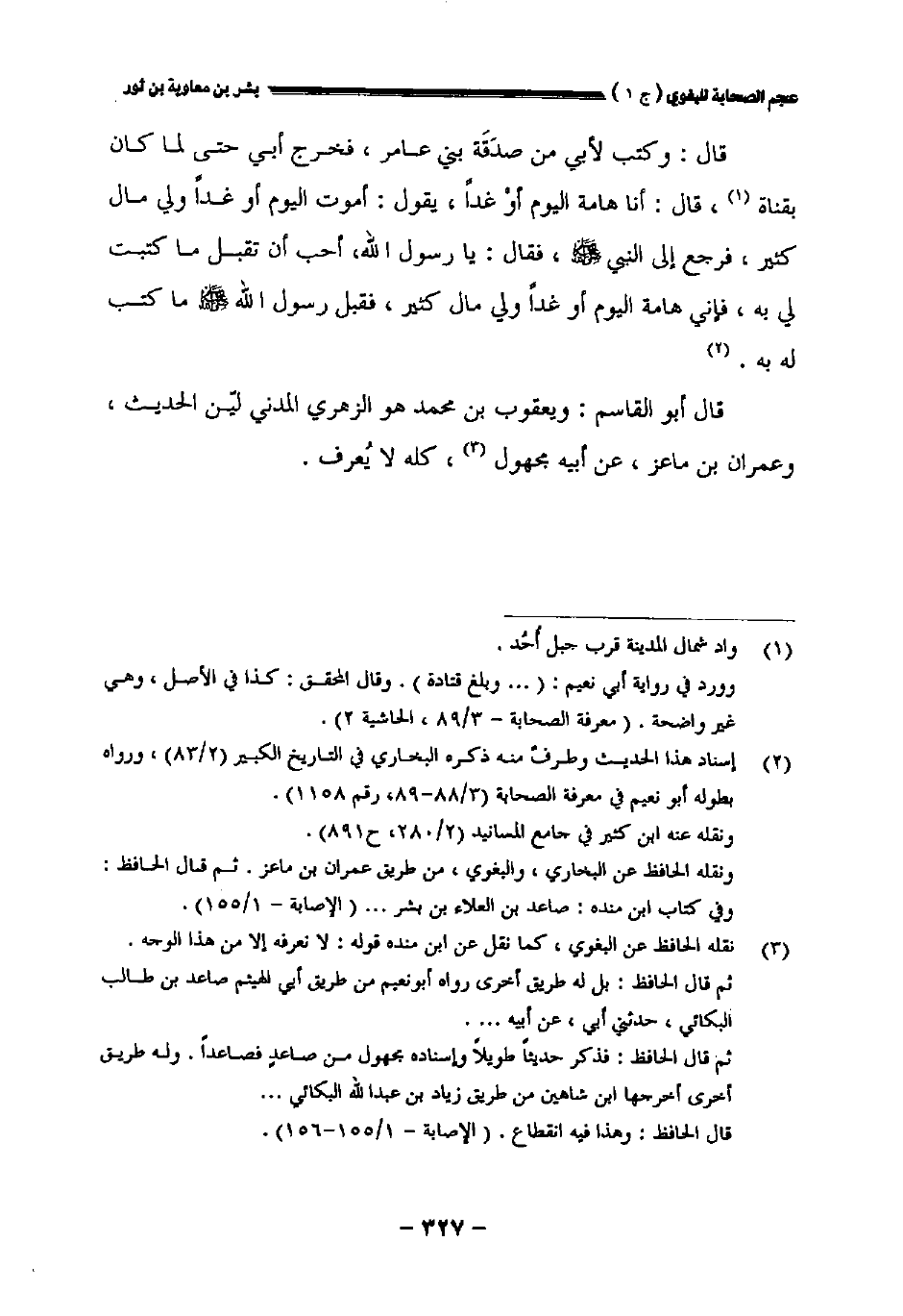 قال: وكتبت لأبي من صدقة بني عامر، فخرج أبي حتى لما كان بقناة، قال: أنا هامة اليوم، أو غد، يقول: أموت اليوم، أو غد، ولي مال كثير، فرجع إلى النبي صلى الله عليه وسلم، فقال: يا رسول الله، أحب أن تقبل ما كتبت لي به، فإني هامة اليوم، أو غد، ولي مال كثير، فقبل رسول الله صلى الله عليه وسلم ما كتب له به.