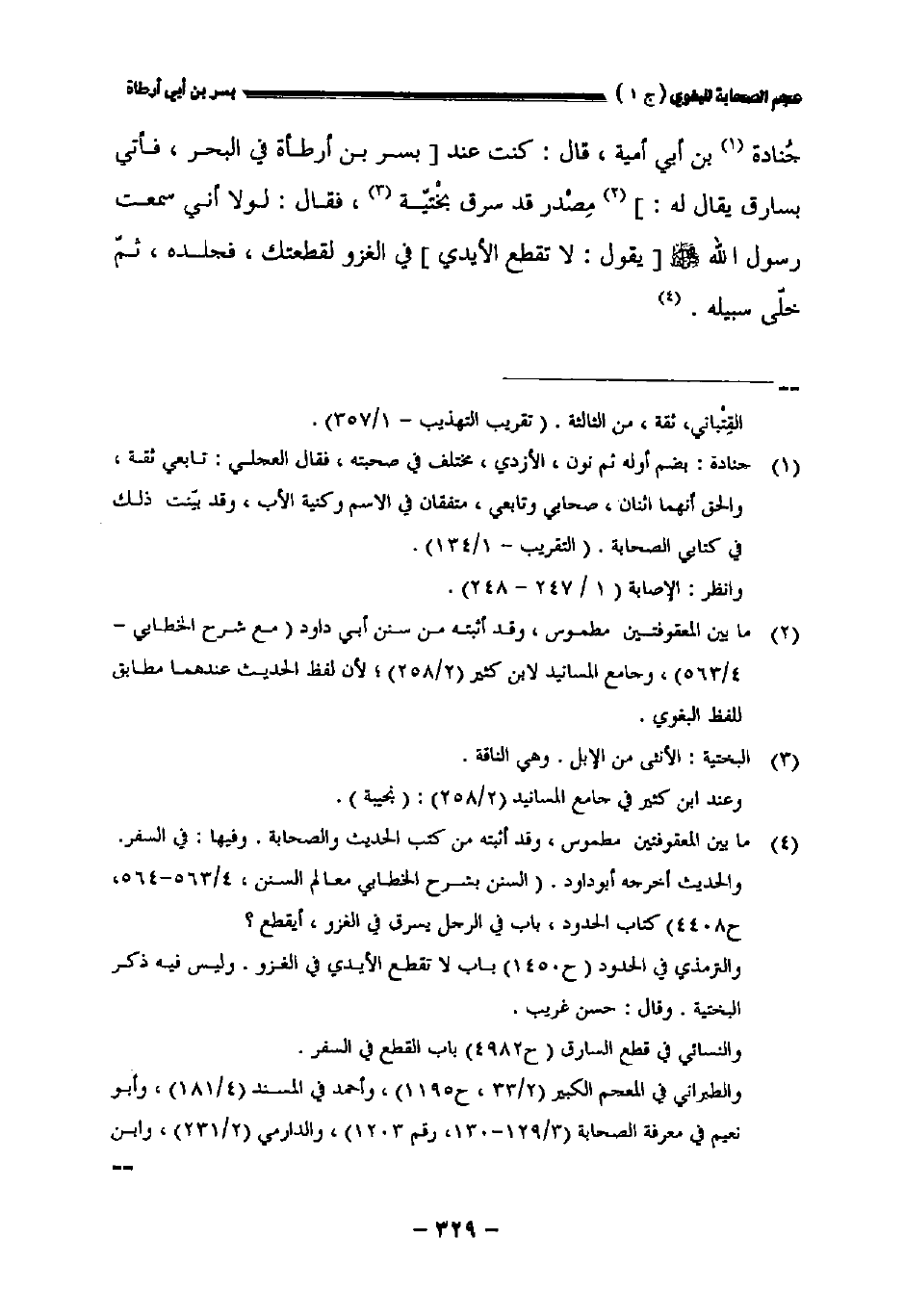 جنادة بن أبي أمية قال: كنت عند [بسر بن أرطأة في البحر فأتى بسارق يقال له:] مصدر قد سرق بختيه فقال: لولا أني سمعت رسول الله صلى الله عليه وسلم [يقول: لا تقطع الأيدي] في الغزو لقطعتك فجلده ثم خلى سبيله.