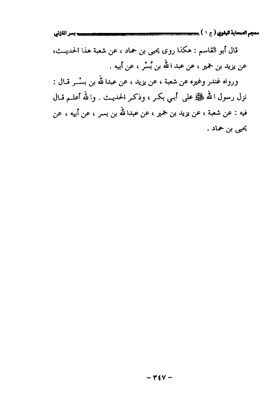 ورواه غندر وغيره عن شعبة عن يزيد عن عبد الله بن بسر قال: نزل رسول الله صلى الله عليه وسلم على أبي بكر وذكر الحديث. والله أعلم قال فيه: عن شعبة عن يزيد بن خمير عن عبد الله بن بسر عن أبيه عن يحيى بن حماد.