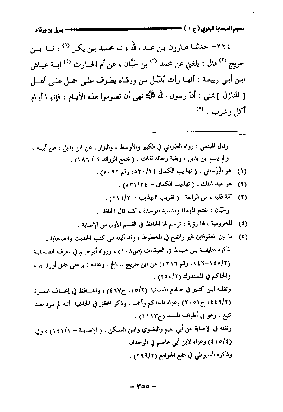 ٢٢٤ - حدثنا هارون بن عبد الله نا محمد بن بكر نا ابن جريج قال: بلغني عن محمد بن حبان عن أم الحارث ابنة عياش بن أبي ربيعة: أنها رأت بديل بن ورقاء يطوف على جمل على أهل [المنازل] بمنى: أن رسول الله صلى الله عليه وسلم نهى أن تصوموا هذه الأيام فإنها أيام أكل وشرب.
