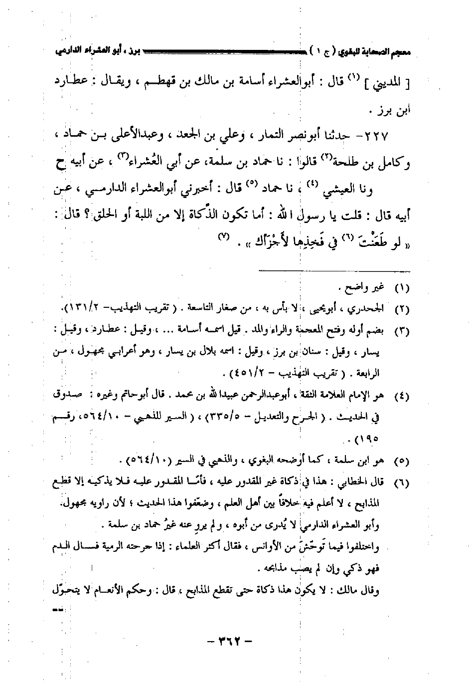 ٢٢٧ - حدثنا أبو نصر التمار وعلي بن الجعد وعبد الأعلى بن حماد وكامل بن طلحة قالوا: نا حماد بن سلمة عن أبي العشراء عن أبيه ح