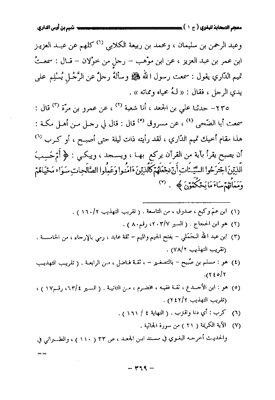 ٢٣٥ - حدثنا علي بن الجعد أنا شعبة عن عمرو بن مرة قال سمعت أبا الضحى عن مسروق قال قال لي رجل من أهل مكة: هذا مقام أخيك تميم الداري لقد رأيته ذات ليلة حتى أصبح أو كرب أن يصبح يقرأ بآية من القرآن يركع بها ويسجد ويبكي {أم حسب الذين اجترحوا السيئات أن نجعلهم كالذين أمنوا وعملوا الصالحات سواء محياهم ومماتهم ساء ما يحكمون}.