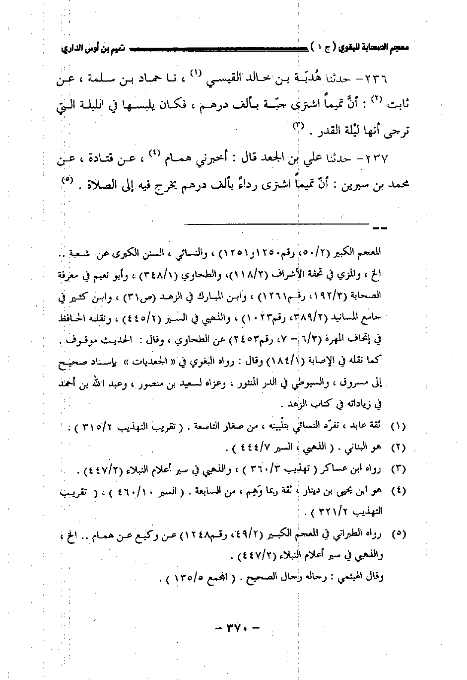 ٢٣٧ - حدثنا علي بن الجعد قال أخبرني همام عن قتادة عن محمد بن سيرين أن تميما اشترى رداء بألف درهم يخرج فيه إلى الصلاة. . . . .