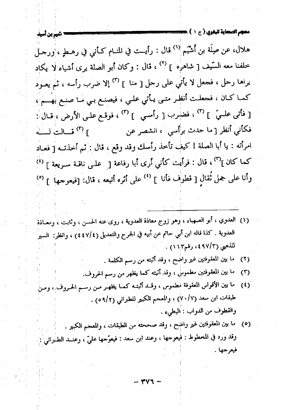 هلال عن صلة بن أشيم قال: رأيت في المنام كأني في رهط ورجل خلفنا معه السيف [شاهره] قال: وكان أبو الصلة يرى أشياء لا يكاد يراها رجل فجعل لا يأتي على رجل [منا] إلا ضرب رأسه ثم يعود كما كان فجعلت أنظر متى يأتي علي فيصنع بي ما صنع بهم [فأتى علي] فضرب [رأسي] فوقع على الأرض قال: فكأني أنظر [ما حدث برأسي انشطر عن] قالت له امرأته: ياأبا الصلة! كيف تأخذ رأسك وقد وقع قال: ثم أخذته [فعاد كما كان] قال: فرأيت كأني أرى أبا رفاعة [على ناقة سريعة] وأنا على جمل ثقال [قطوف فأنا] على أثره أتبعه قال: [فيعوجها]