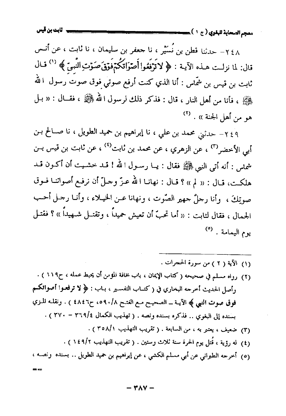 ٢٤٨ - حدثنا قطن بن نسير نا جعفر بن سليمان نا ثابت عن أنس قال: لما نزلت هذه الآية {لا ترفعوا أصواتكم فوق صوت النبي} قال ثابت بن قيس بن شماس: أنا الذي كنت أرفع صوت رسول الله صلى الله عليه وسلم فأنا من أهل النار، قال: فذكر لرسول الله صلى الله عليه وسلم، فقال: " بل هو من أهل الجنة ". . . . .