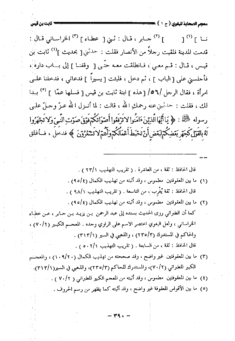 نا] [] جابر قال ثني [عطاء] الخراساني قال: قدمت المدينة فلقيت رجلا من الأنصار فقلت: حدثني [بحديث] ثابت بن قيس، قال: قم معك، فانطلقت معه حتى [وقفنا] إلى باب داره فأجلسني على [الباب] ثم دخل فلبثت [يسيرا] فدعاني فدخلنا على امرأة فقال الرجل // ٥٦ // [هذه] ابنة ثابت بن قيس [فسلها عما] بدا لك، فقلت: حدثيني عنه رحمك الله قالت: لما أنزل الله عز وجل على رسوله صلى الله عليه وسلم {ياأيها الذين ءامنوا لا ترفعوا أصواتكم فوق صوت النبي ولا تجهروا له بالقول كجهر بعضكم لبعض أن تحبط أعمالكم وأنتم لا تشعرون} فدخل فأغلق