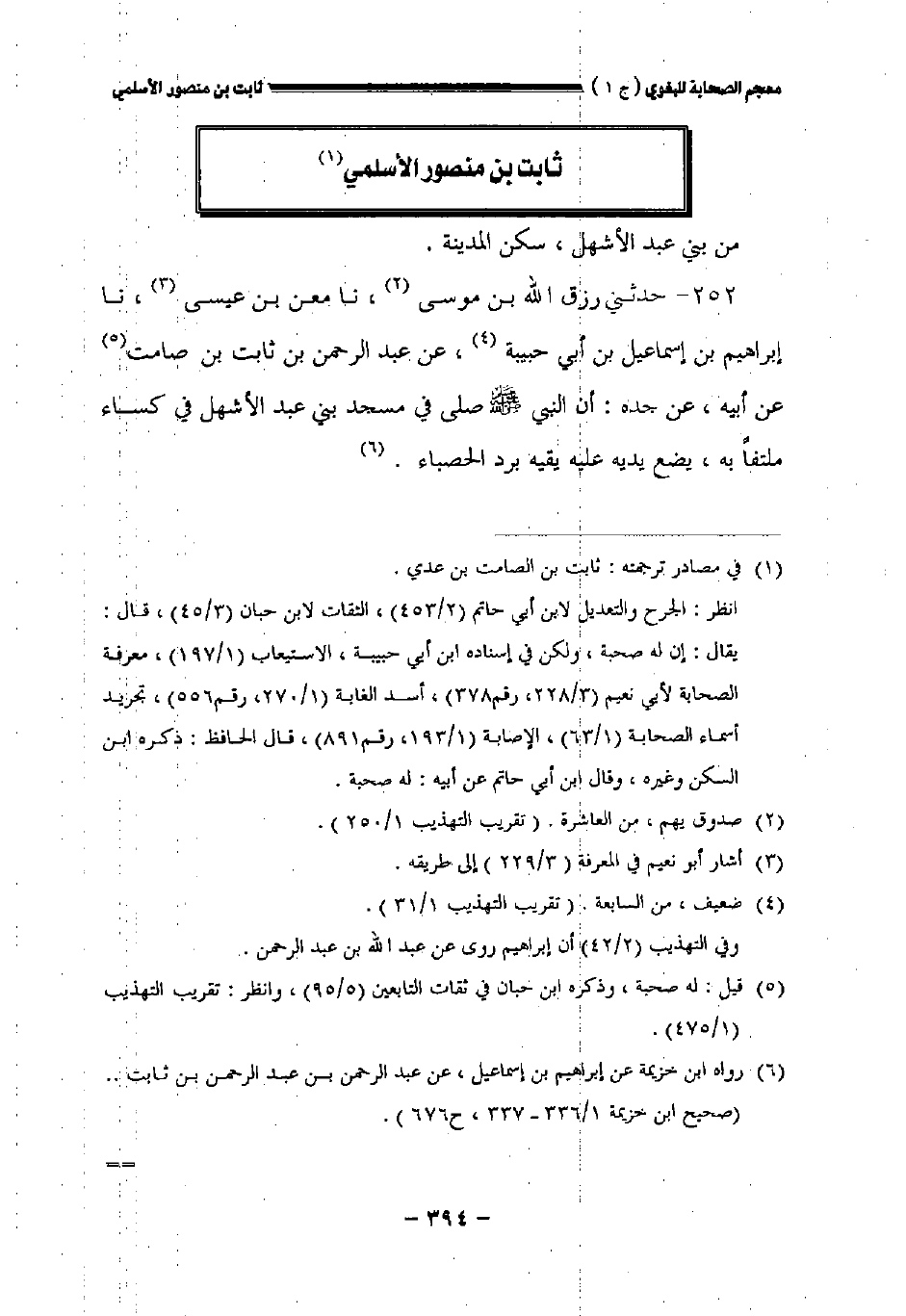 ٢٥٢ - حدثني رزق الله بن موسى نا معن بن عيسى نا إبراهيم بن إسماعيل بن أبي حبيبة عن عبد الرحمن بن ثابت بن صامت عن أبيه عن جده: أن النبي صلى الله عليه وسلم صلى في مسجد بني عبد الأشهل في كساء ملتفا به يضع يديه عليه بقية برد الحصباء.