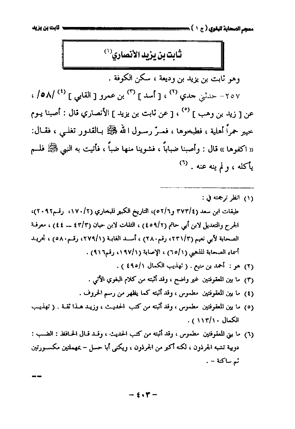 ٢٥٧ - حدثني جدي [أسد] بن عمرو [القابي] // ٥٨ // عن [زيد بن وهب] [عن ثابت بن يزيد] الأنصاري قال: أصبنا يوم خيبر حمرا أهلية فطبخوها فمر رسول الله صلى الله عليه وسلم بالقدور تغلي فقال: " اكفوها " قال: وأصبنا ضبابا فشوينا منها ضبا فأتيت به النبي صلى الله عليه وسلم فلم يأكله ولم ينه عنه.