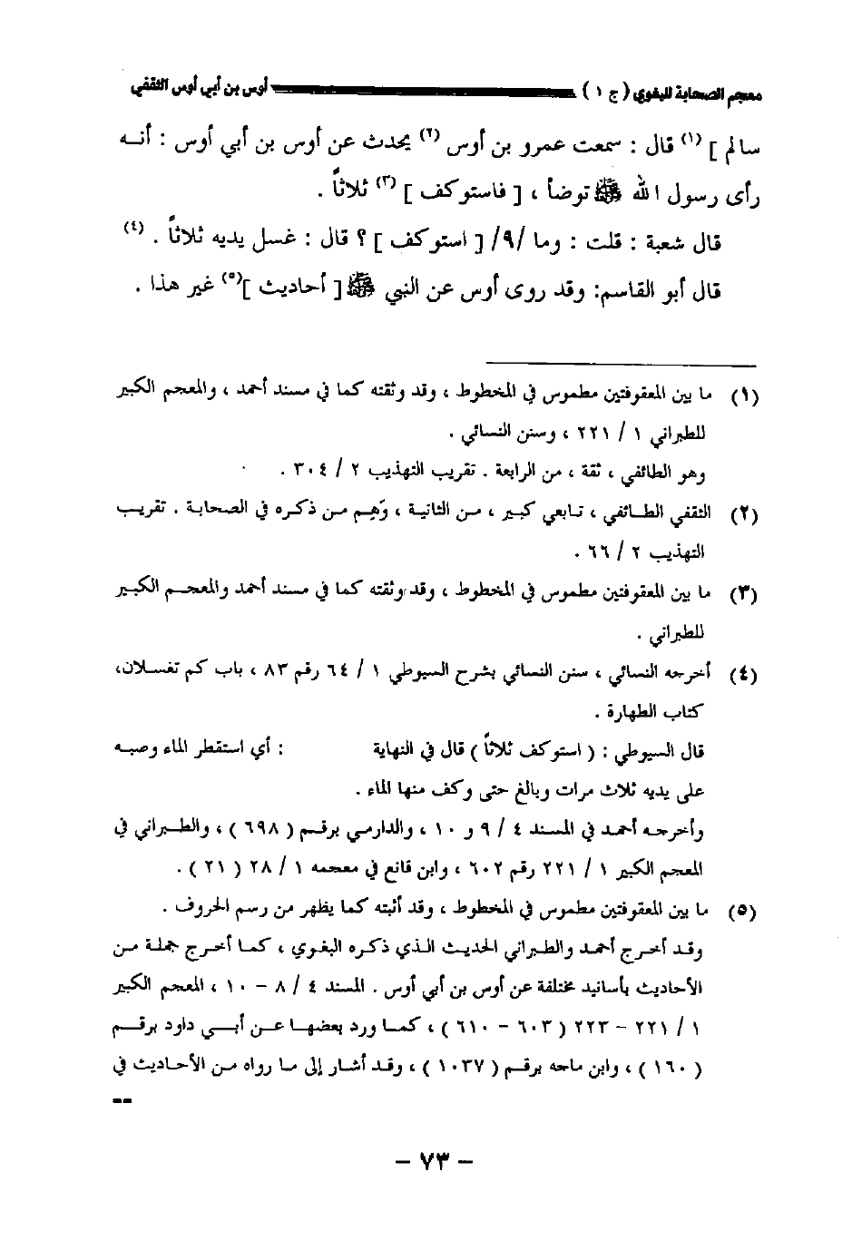 سالم] قال: سمعت عمرو بن أوس يحدث عن أوس بن أبي أوس: أنه رأى رسول الله صلى الله عليه وسلم توضأ [فاستوكف] ثلاثا.