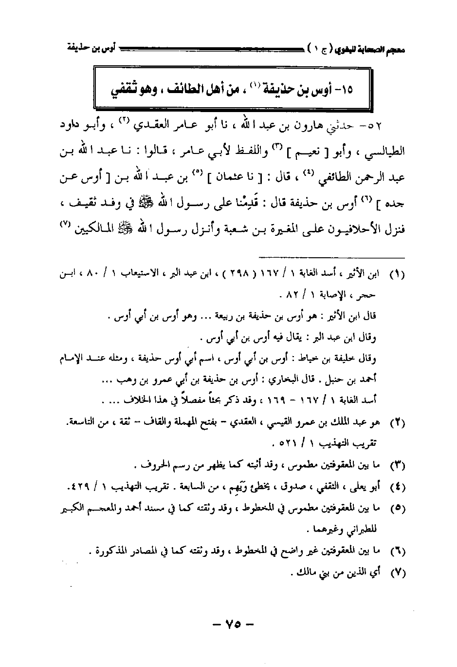 ٥٢ - حدثني هارون بن عبد الله نا أبو عامر العقدي وأبو داود الطيالسي وأبو [نعيم] واللفظ لأبي عامر، قالوا: نا عبد الله بن عبد الرحمن الطائفي، قال: [نا عثمان] بن عبد الله بن [أوس عن جده] أوس بن حذيفة قال: قدمنا على رسول الله صلى الله عليه وسلم في وفد ثقيف، فنزل الأحلافيون على المغيرة بن شعبة وأنزل رسول الله صلى الله عليه وسلم المالكين