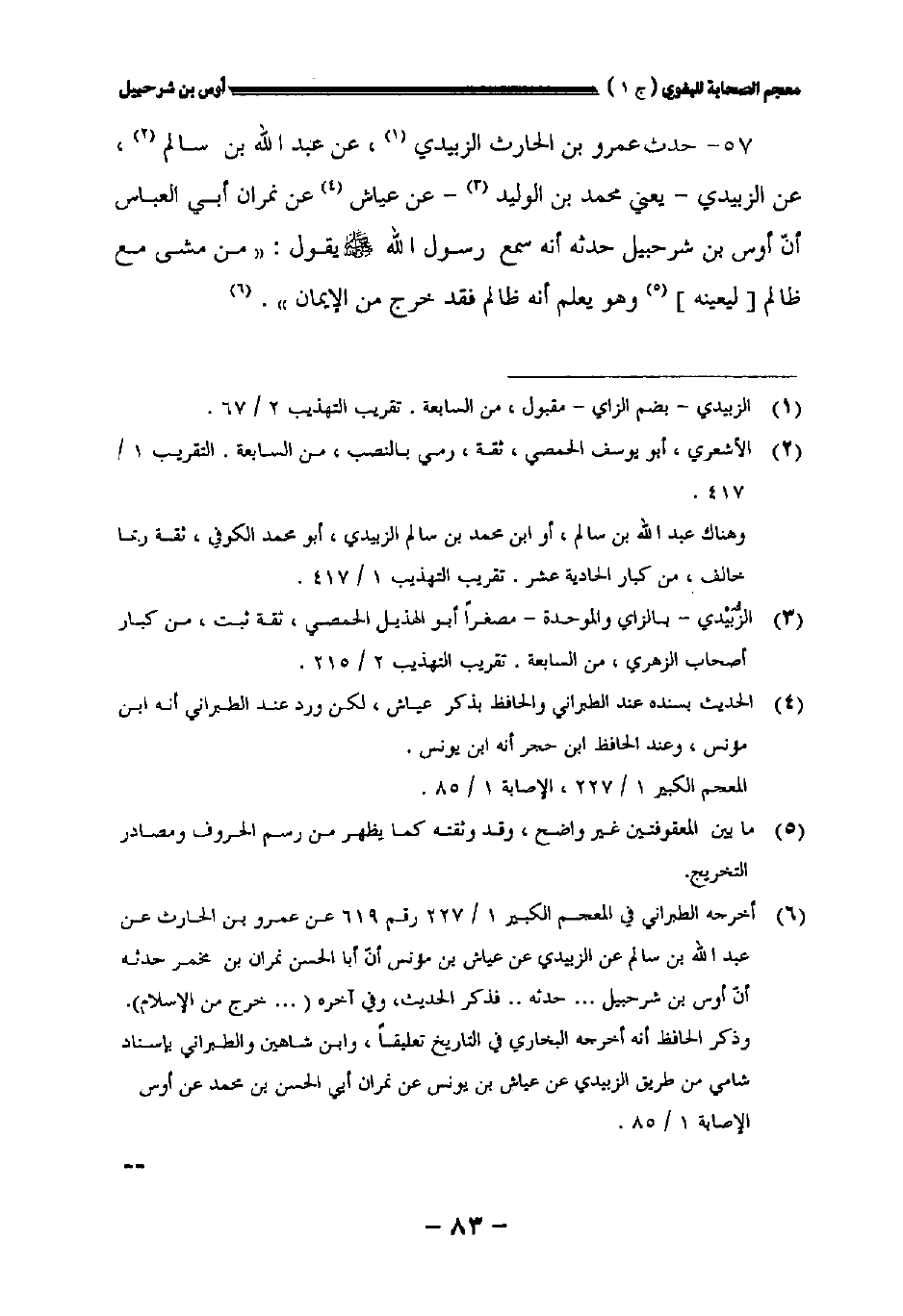 ٥٧ - حدث عمرو بن الحارث الزبيدي عن عبد الله بن سالم عن الزبيدي يعني محمد بن الوليد عن عياش عن نمران أبي العباس أن أوس بن شرحبيل حدثه أنه سمع رسول الله صلى الله عليه وسلم يقول: " من مشى مع ظالم [ليعينه] وهو يعلم أنه ظالم فقد خرج من الإيمان.