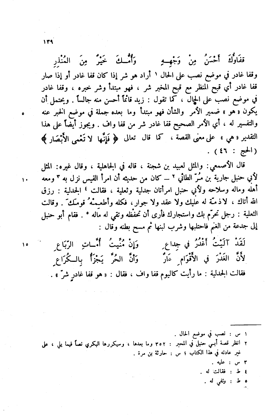 قفاؤك أحسن من وجهه ... وأمك خير من المنذر وقفا غادر في موضع نصب على الحال (1) أراد هو شر إذا كان قفا غادر أو إذا صار قفا غادر أي قبح المنظر مع قبح المخبر شر، فهو مبتدأ وشر خبره، وقفا غادر في موضع نصب على الحال، كما تقول: زيد قائماص أحسن منه جالساً. ويحتمل أن يكون " هو " ضمير الأمر والشأن فهو مبتدأ وما بعده جملة في موضع الخبر عنه والتفسير له، أي الأمر الصحيح قفا غادر شر من قفا واف. ويجوز أيضاً على هذا التقدير " هي " على معنى القصة، كما قال تعالى {فإنها لا تعمى الأبصار} (الحج: 46) .