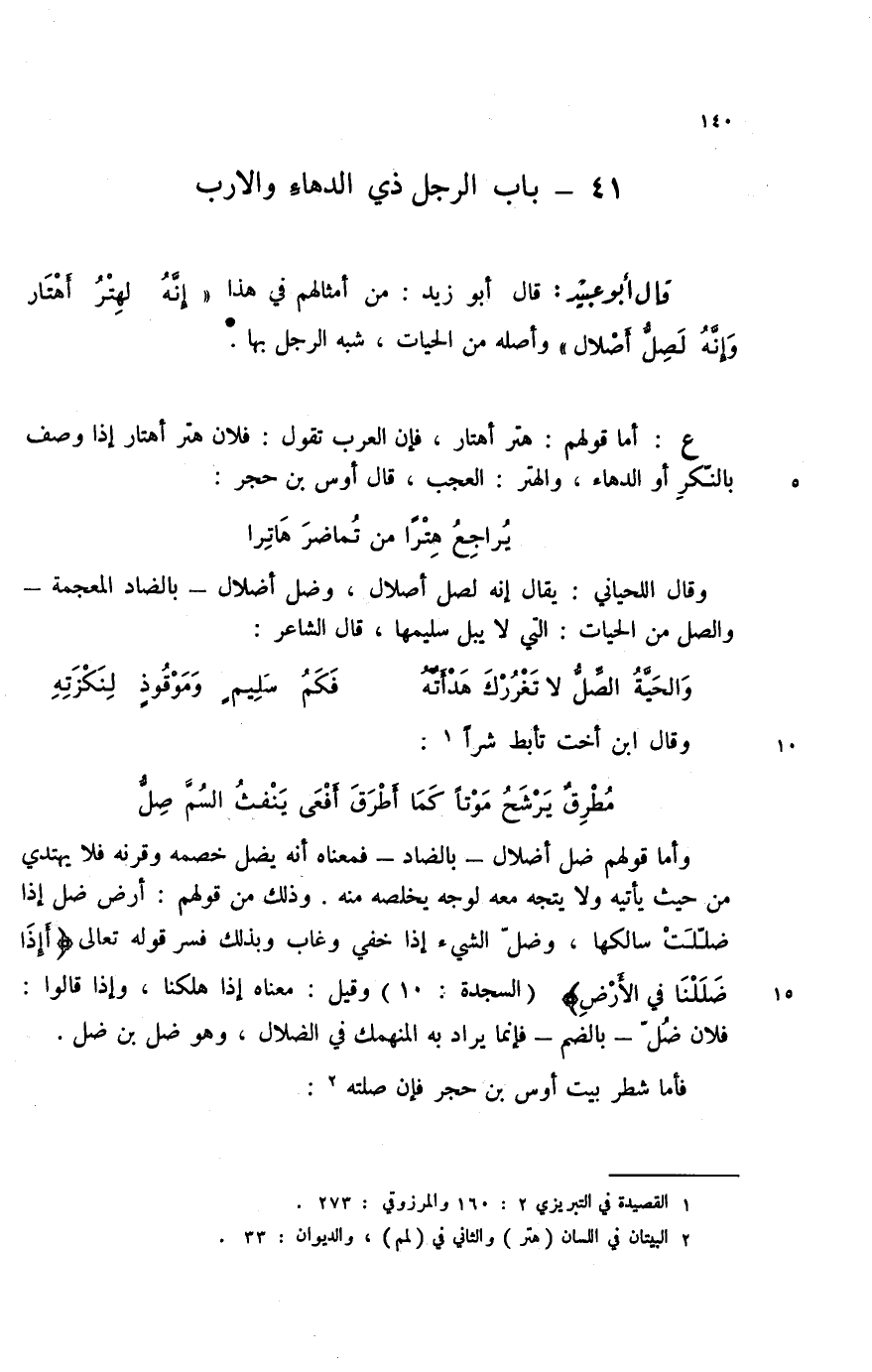 مطرق يرشح موتاً كما أطرق أفعى ينفث السم صل ... وأما قولهم ضل أضلال؟ بالضاد؟ فمعناه أنه يضل خصمه وقرنه فلا يهتدي من حيث يأتيه ولا يتجه معه لوجه يخلصه منه. وذلك من قولهم: أرض ضل إذا ضللت سالكها، وضل الشيء إذا خفي وغاب وبذلك فسر قوله تعالى {أإذا ضللنا في الأرض} (السجد: 10) وقيل: معناه إذا هلكنا، وإذا قالوا: فلان ضل؟ بالضم؟ فإنما به المنهمك في الضلال، وهو ضل بن ضل.