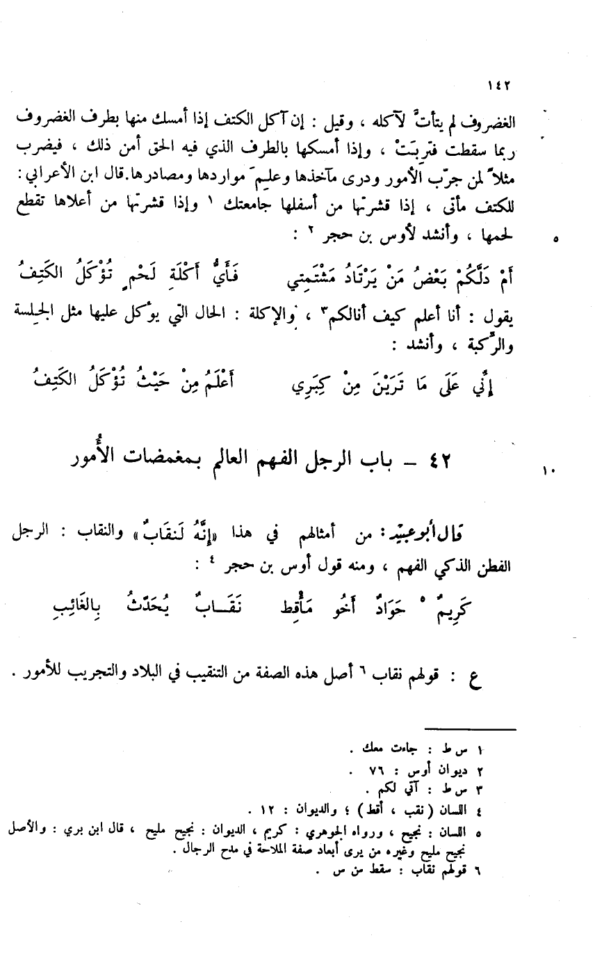 قال أبو عبيد: من أمثالهم في هذا " إنه لنقاب " والنقاب: الرجل الفطن الذكي الفهم، ومنه قول أوس بن حجر (4) :