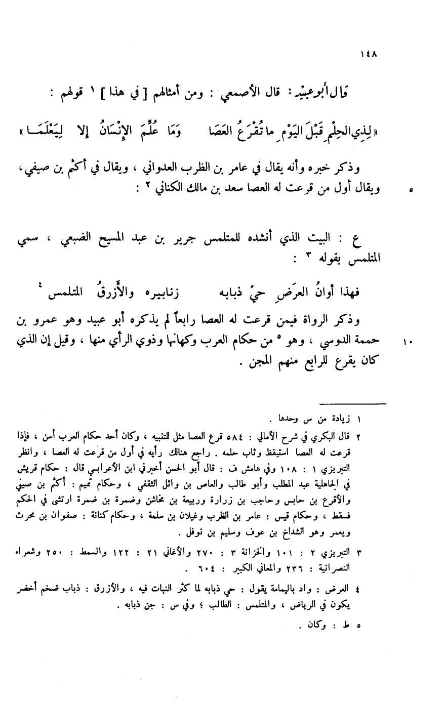 " لذي الحلم قبل اليوم ما تقرع العصا ... وما علم الإنسان إلا ليعلما " وذكر خبره وأنه يقال في عامر بن الظرب العدواني، ويقال في أكثم بن صفي، ويقال أول من قرعت له العصا سعد بن مالك الكناني (2) :