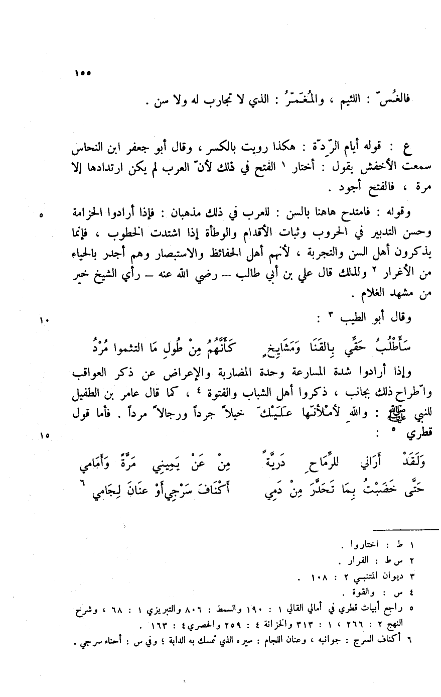وقوله: فامتدح هاهنا بالسن: للعرب في ذلك مذهبان: فإذا أرادوا الحزامة وحسن التدبير في الحروب وثبات الأقدام والوطأة إذا اشتدت الخطوب، فإنما يذكرون أهل السن والتجربة، لأنهم أهل الحفائظ والاستبصار وهم أجدر بالحياء من الأغرار (2) ولذلك قال علي بن أبي طالب؟ رضي الله عنه؟ رأي الشيخ خير من مشهد الغلام.
